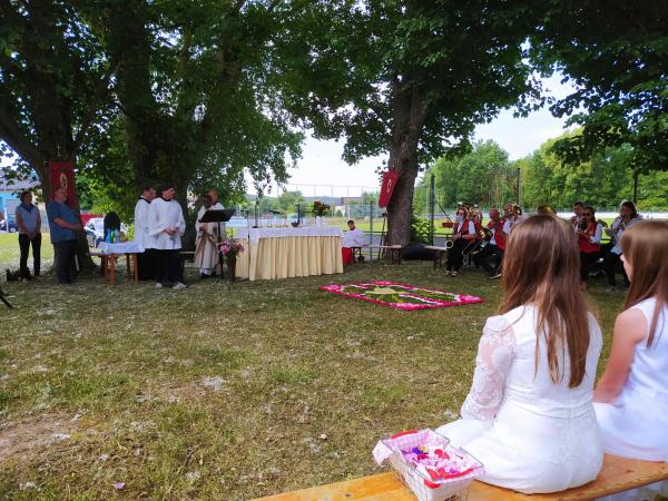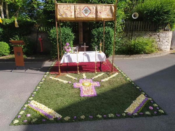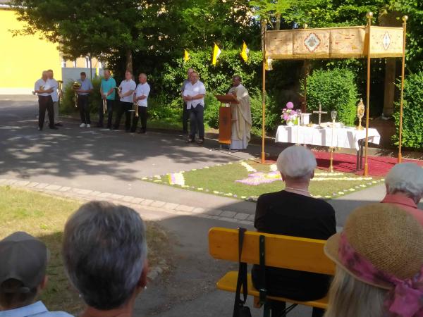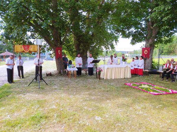 Unsere Bilder zeigen das Fronleichnamsfest in Kleinrinderfeld und in Moos, wo immer am Sonntag nach dem Feiertag die Prozession stattfindet. In beiden Orten fand auch schon die Messfeier mit Priester Benjamin Lubega im Freien statt. Schön war, dass in diesem Jahr durch die Initiative unserer neuen Gemeindeteams wieder viele Kinder teilgenommen haben und Blumen auf Weg für das Allerheiligste streuten. In Moos hatten die Kinder sogar auf den Straßen am Prozessionsweg mit Straßenmalkreide eucharistische Symbole gemalt. Damit bei einem so schönen Fest alles gelingt, braucht es viele Helfer/innen im Hintergrund und viele, die auch sichtbar mitwirken, sei es die Blasmusik, Vorbeter, Himmelträger, Feuerwehr, Ministranten und eben die Blumen- und Teppichschmückerinnen. Ihnen allen ein herzliches Vergelt´s Gott!